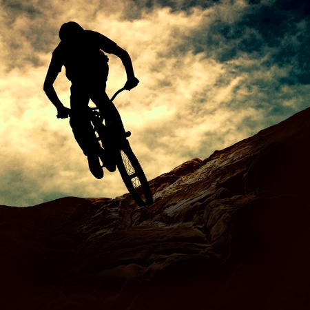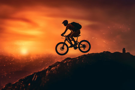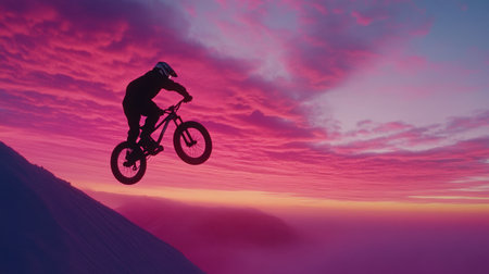 A daring mountain biker captures the essence of adventure while performing an impressive jump against a stunning sunset sky filled with vibrant colors.