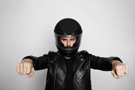 Head shot of brutal bearded biker man wears helmet and dressed in a black leather jacket. Free space for text.