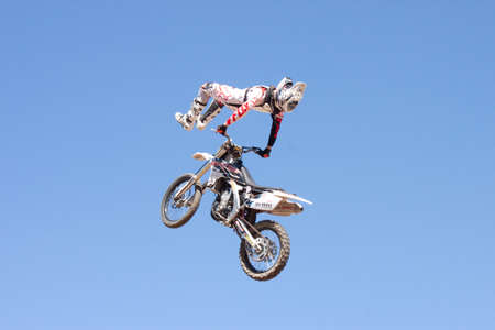 Tyumen, Russia - June 10, 2009: Red Bull X-Fighters Exhibition Tour. Freestyle Motocross. Sportsman carries out a trick