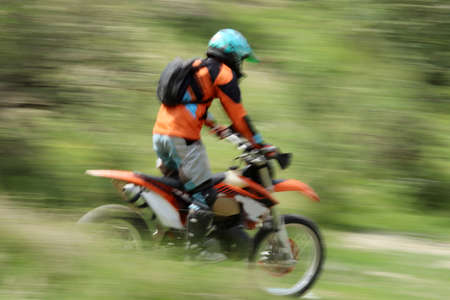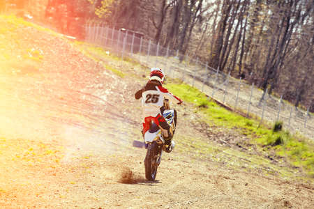 Forest trail, road. Live shot of professional motorcycle rider driving on Enduro motorcycle during qualifying session, outdoors at summer evening.