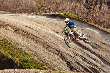 Motocross concept, a biker goes off-road making extreme skiing. In pursuit of adrinalin, sport concept. Dangerous sport.