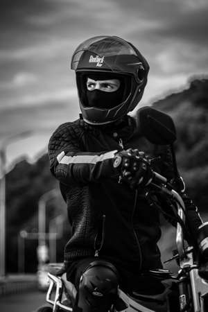 Man rides a motorcycle in the city.Young man in helmet and equipment rides a motorcycle on the road.Motorcyclist riding a bike during the day on the road.Black and white photo