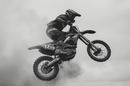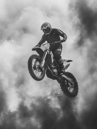 Dramatic motocross jump through dense smoke in a black and white cinematic action moment