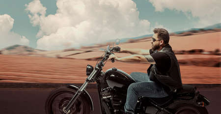 Stylish brutal biker riding motorbike in speed highway in summer evening time. Vintage cinematic background and dramatic cloudy sky. Concept of fashion, style and hobby