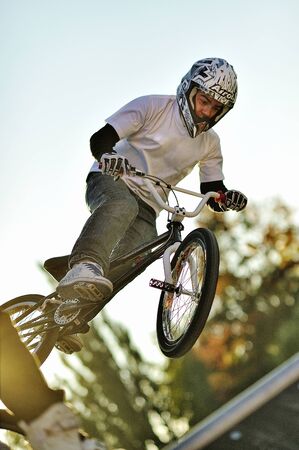 Young man doing tricks on a BMX bike. BMX freestyle against the backdrop of urban landscape. Extreme sports is very popular among youth. Concept of sports accessories.