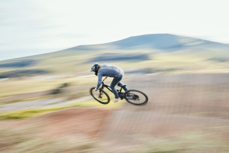 Sports, energy and man riding a bike in nature training for race, marathon or competition. Fitness, blur motion and male athlete biker practicing for an outdoor cardio exercise, adventure or workout.