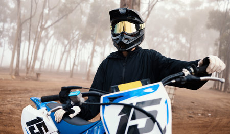 Motorcycle, person and sport in forest with training for competition, ride in nature with action and helmet. Extreme, adrenaline and exercise, athlete and transport with dirt bike, freedom and travel