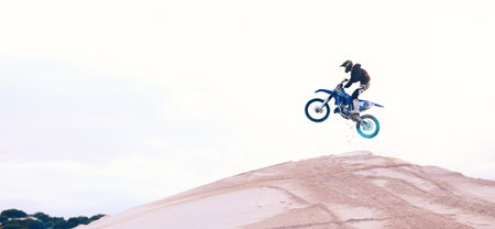 Sand, jump or athlete driving motorbike for action, adventure or fitness with performance or adrenaline. Speed, air or driver on motorcycle on dunes hill for training, exercise or race challenge
