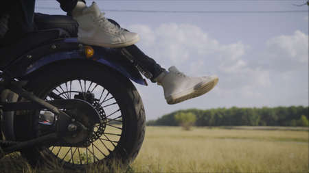 White sneakers and motorcycle wheel. White sneakers on the background of a motorcycle.