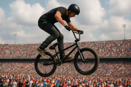 Bmx rider jumping with his bike in a stadium full of spectators, during a bmx freestyle competition
