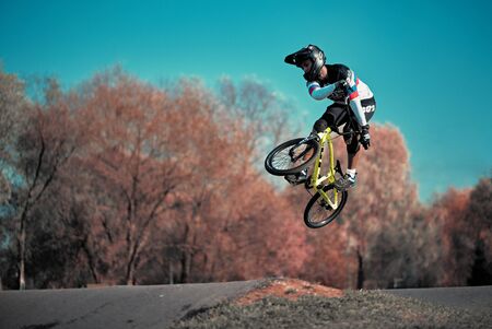 Moscow, Russia - Oct 17, 2019: Young boy jumping with his BMX Bike at pump track. BMX race. Cyclist riding on pump track. Rider in action at bike sport. Cool athlete cyclist on a bike. Pump biking.
