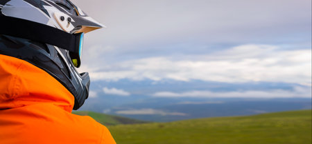 portrait of a cyclist or motorcyclist on top of a mountain, viewed from the back, looking at the mountain range in the clouds. panoramic mountain view, sport and banner concept for advertising
