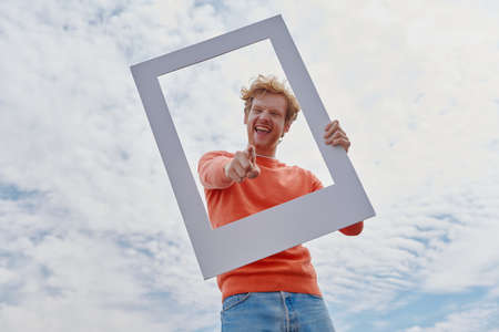 Playful young redhead man looking through a picture frame and gesturing while standing outdoors