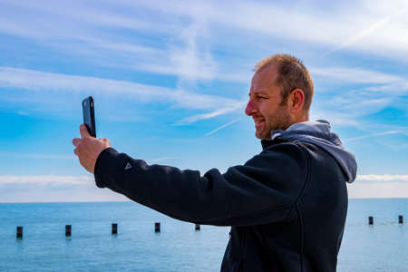 Bearded man in raincoat with backpack on sea landscape with blue cloudy sky background with smartphone in hand taking picture. Guy photographing nature on cell phone, active lifestyle travel concept.