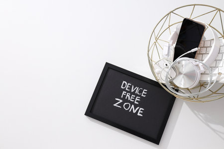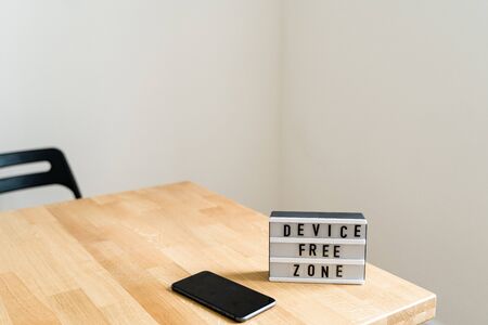 Digital detox day. Lightbox on wooden background and white walls. Gadget ban