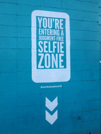 HONOLULU - AUGUST 20: 'You're Entering A Judgement-Free Selfie Zone' Sign on blue wall with hashtag talking about the latest crazes in America on Oahu, Hawaii. August 20, 2014.