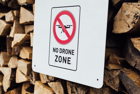 HALLSTATT, AUSTRIA - JANUARY 2019: street sign saying No Drone Zone on firewood stack background.