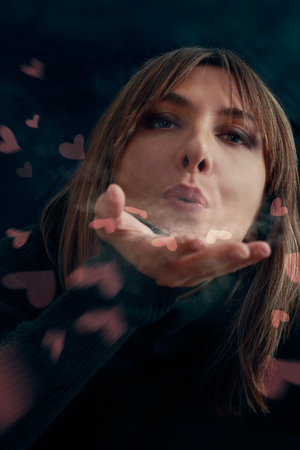 Valentines concept. Woman is blowing hearts and kisses. Valentines background with copyspace