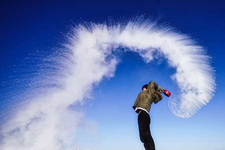 Winter. Woman with red hair wearing ear muffs blowing on snow in hands