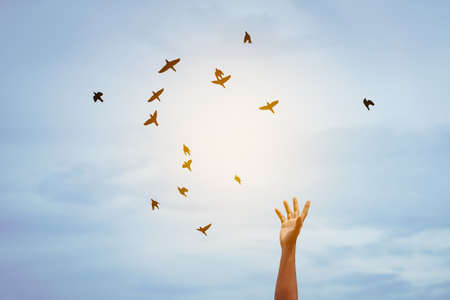 Man raise open hand up and birds flying on sunset sky abstract background. Copy space of freedom travel adventure and business victory concept. Vintage tone filter effect color style.