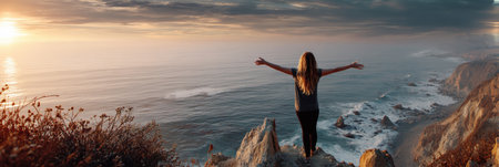 As the sun sets over the ocean, a woman spreads her arms wide on a cliffs edge, enjoying the beautiful view and the calming sea breeze.