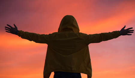 Happy free man standing alone with raised arms during a beautiful sunrise in the morning. Outdoor activities, Togetherness with nature, Travel nature, Summer vacation trip