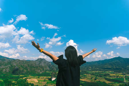 Copy space freedom man hand rising up summer vacation and freedom concept blue sky and mountain in abstract summer background. Vintage clean color tone style