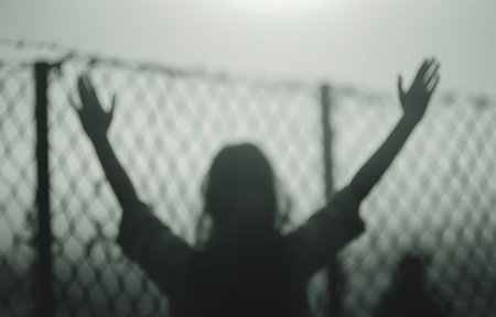 A hand reaches out towards the viewer through a barbed wire fence, with other figures blurred in the background.