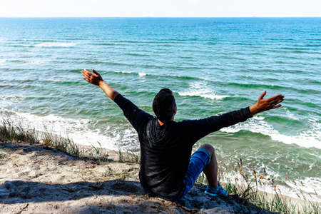 freedom man sitting hand rising up summer vacation and freedom concept blue sky and mountain in abstract summer background.