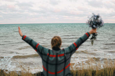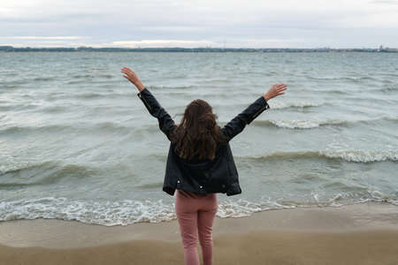 A young woman with her hands up in the fresh air against the background of the sea. Place for your text