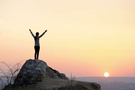 Silhouette of a woman hiker standing alone on big stone at sunset in mountains. Female tourist raising her hands up on high rock in evening nature. Tourism, traveling and healthy lifestyle concept.