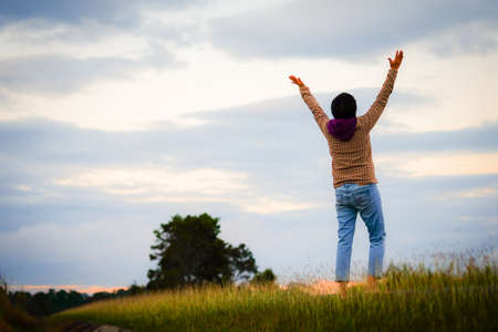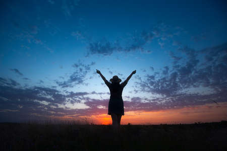 Lonely woman in the hat staying in the grass with raised hands to the sky at the summer twilight. On the cloudy sky.