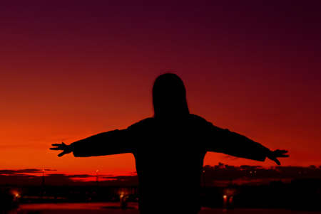 Silhouette woman on sunset background. Woman raising his hands in worship. Christian Religion concept background.