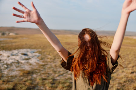 Woman standing in middle of field with hands in air, red hair, nature beauty, outdoor lifestyle concept