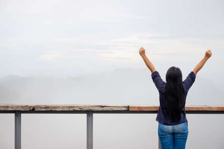 Back woman with hand raised enjoy the mist scene on the top of the mountain