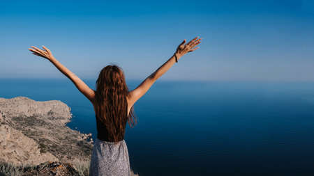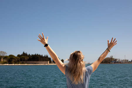 Rearview of blond woman stand against blue sky with raised arms embracing world, sea vacation and holiday in countryside