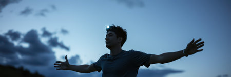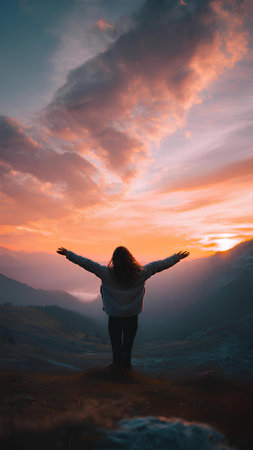 A person stands with arms outstretched, silhouetted against a vibrant sunset. The image showcases a warm color palette with hues of orange, yellow, and blue. The composition emphasizes a sense of openness and vastness, potentially suitable for themes related to achievement or aspiration. It can be used for various editorial and commercial purposes.