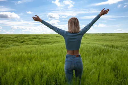 Back view of blonde woman who stands toward the sunset in a wheat field with raised hands