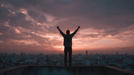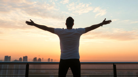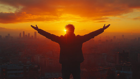 Male silhouette stretching arms wide, overlooking urban skyline during golden hour sunset, feeling liberation and releasing workplace pressures amid dramatic city panorama
