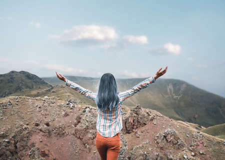 Unrecognizable young woman standing on peak of cliff with raised arms in mountains, rear view.