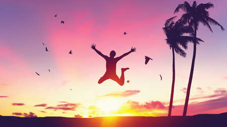 Man jumping and birds flying with palm tree at tropical sunset beach abstract background. Freedom feel good and travel adventure concept. Vintage tone filter effect color style.