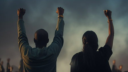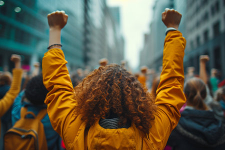 Group of protesters with their fists raised up in the air. Activists protesting on the street. People publicly demonstrating opposition. Gloomy city scenery. Generative AI.