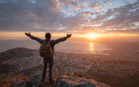 A man stands atop a mountain with arms raised, taking in a stunning sunset. The scene captures vibrant colors in the sky and the surrounding landscape below. The lighting suggests late afternoon. Suitable for illustrating travel, adventure, and the appreciation of nature for various commercial projects.