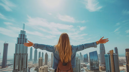 Back view of girl with outstretched arms looking at beautiful city