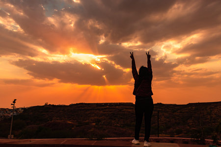 Silhouette of a woman standing over a view of the landscape in the sunrise,Image blured style