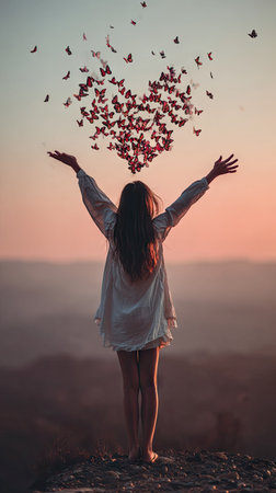 A woman stands with arms outstretched beneath a formation of butterflies shaped like a heart. The scene features warm colors of a sunset sky. The image has a soft focus with a romantic feel. Suitable for editorial and commercial use.