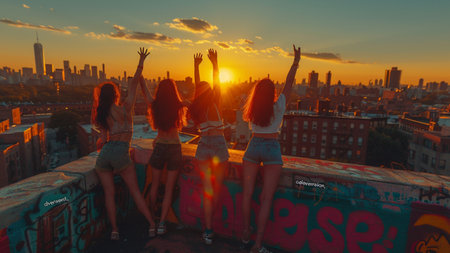 Group of young women having fun on the roof of a building at sunset
