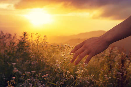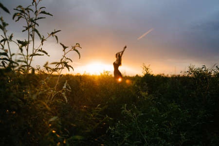 Young woman standing in beautiful nature at sunset meditating with arms spread gently lit by the setting sun.