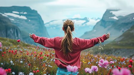 Young traveler with a backpack on his back stands on the edge of a cliff against the backdrop of beautiful mountains and wildflowers. Generative AI