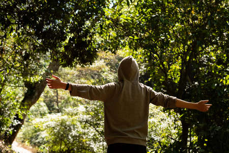 View from behind of a young man standing in beautiful green nature with his arms spread widely, enjoying life and abundance.